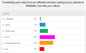 After leading everyone through a reflection exercise that challenged them to evaluate their culture for things to improve, Joey asked the audience to rate their firm’s culture again. Most participants lowered their culture rating scores, revealing what may be the greatest insight from the session—the importance of taking an objective and honest look at firm culture. See the reassessments in Figure 4.